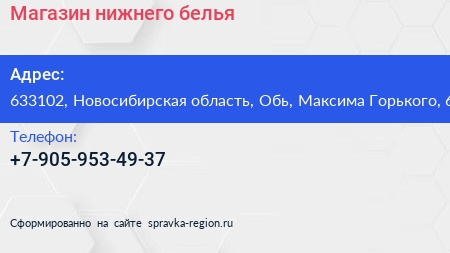 Магазин нижнего белья по адресу 633102, Новосибирская область, Обь, Максима Горького, 6 в дальнейшем Организация, размещена в следующих категориях: