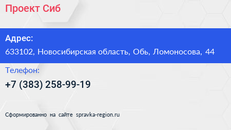 Проект-Сиб по адресу 633102, Новосибирская область, Обь, Ломоносова, 44 в дальнейшем Организация, размещена в следующих категориях: