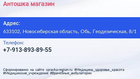 Антошка, магазин по адресу 633102, Новосибирская область, Обь, Геодезическая, 8/1 в дальнейшем Организация, размещена в следующих категориях: