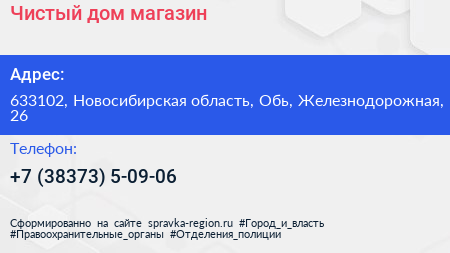 Чистый дом, магазин по адресу 633102, Новосибирская область, Обь, Железнодорожная, 26 в дальнейшем Организация, размещена в следующих категориях: