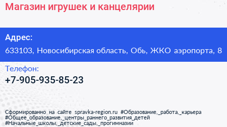 Магазин игрушек и канцелярии по адресу 633103, Новосибирская область, Обь, ЖКО аэропорта, 8 в дальнейшем Организация, размещена в следующих категориях: