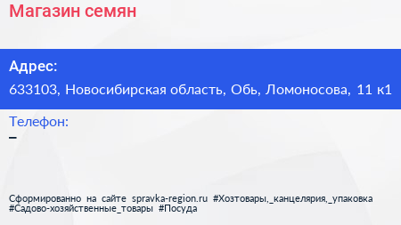 Магазин семян по адресу 633103, Новосибирская область, Обь, Ломоносова, 11 к1 в дальнейшем Организация, размещена в следующих категориях: