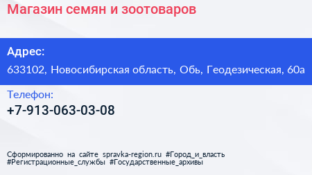 Магазин семян и зоотоваров по адресу 633102, Новосибирская область, Обь, Геодезическая, 60а в дальнейшем Организация, размещена в следующих категориях: