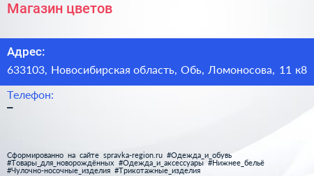 Магазин цветов по адресу 633103, Новосибирская область, Обь, Ломоносова, 11 к8 в дальнейшем Организация, размещена в следующих категориях: