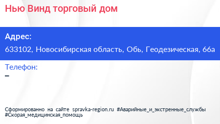 Нью Винд, торговый дом по адресу 633102, Новосибирская область, Обь, Геодезическая, 66а в дальнейшем Организация, размещена в следующих категориях:
