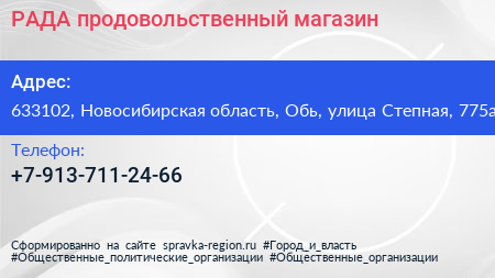 РАДА, продовольственный магазин по адресу 633102, Новосибирская область, Обь, улица Степная, 775а в дальнейшем Организация, размещена в следующих категориях: