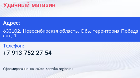 Удачный, магазин по адресу 633102, Новосибирская область, Обь, территория Победа снт, 1 в дальнейшем Организация, размещена в следующих категориях:
