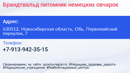 Брандтвальд, питомник немецких овчарок по адресу 630512, Новосибирская область, Обь, Первомайский переулок, 7 в дальнейшем Организация, размещена в следующих категориях:
