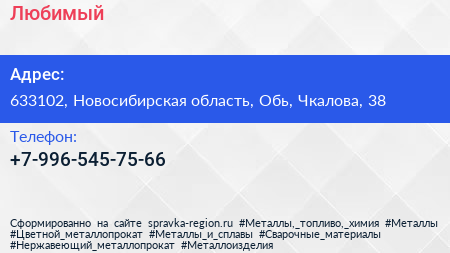 Любимый по адресу 633102, Новосибирская область, Обь, Чкалова, 38 в дальнейшем Организация, размещена в следующих категориях: