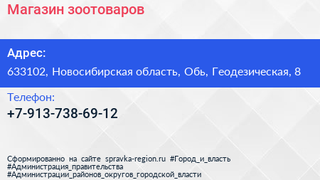 Магазин зоотоваров по адресу 633102, Новосибирская область, Обь, Геодезическая, 8 в дальнейшем Организация, размещена в следующих категориях: