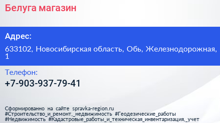 Белуга, магазин по адресу 633102, Новосибирская область, Обь, Железнодорожная, 1 в дальнейшем Организация, размещена в следующих категориях: