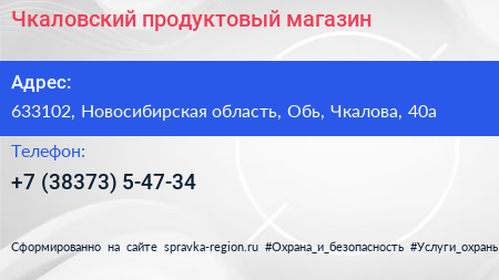 Чкаловский, продуктовый магазин по адресу 633102, Новосибирская область, Обь, Чкалова, 40а в дальнейшем Организация, размещена в следующих категориях: