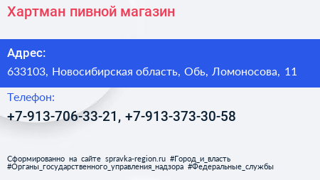 Хартман, пивной магазин по адресу 633103, Новосибирская область, Обь, Ломоносова, 11 в дальнейшем Организация, размещена в следующих категориях: