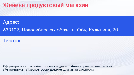 Женева, продуктовый магазин по адресу 633102, Новосибирская область, Обь, Калинина, 20 в дальнейшем Организация, размещена в следующих категориях:
