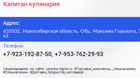 Капитан, кулинария по адресу 633102, Новосибирская область, Обь, Максима Горького, 3 к2 в дальнейшем Организация, размещена в следующих категориях: