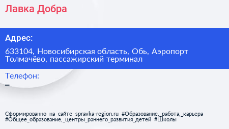 Лавка Добра по адресу 633104, Новосибирская область, Обь, Аэропорт Толмачёво, пассажирский терминал в дальнейшем Организация, размещена в следующих категориях: