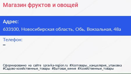 Магазин фруктов и овощей по адресу 633100, Новосибирская область, Обь, Вокзальная, 48а в дальнейшем Организация, размещена в следующих категориях: