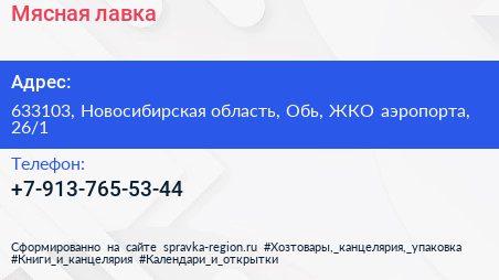 Мясная лавка по адресу 633103, Новосибирская область, Обь, ЖКО аэропорта, 26/1 в дальнейшем Организация, размещена в следующих категориях: