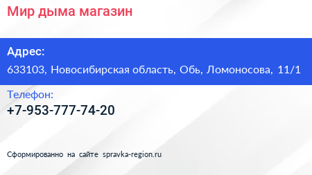 Мир дыма, магазин по адресу 633103, Новосибирская область, Обь, Ломоносова, 11/1 в дальнейшем Организация, размещена в следующих категориях: