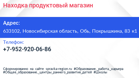 Находка, продуктовый магазин по адресу 633102, Новосибирская область, Обь, Покрышкина, 83 к1 в дальнейшем Организация, размещена в следующих категориях: