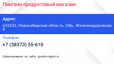 Пингвин, продуктовый магазин по адресу 633102, Новосибирская область, Обь, Железнодорожная, 8 в дальнейшем Организация, размещена в следующих категориях: