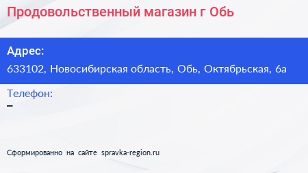 Продовольственный магазин, г. Обь по адресу 633102, Новосибирская область, Обь, Октябрьская, 6а в дальнейшем Организация, размещена в следующих категориях: