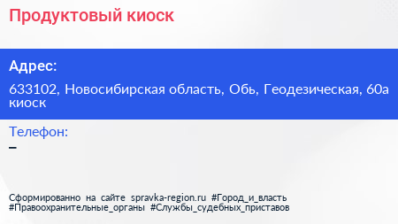 Продуктовый киоск по адресу 633102, Новосибирская область, Обь, Геодезическая, 60а киоск в дальнейшем Организация, размещена в следующих категориях:
