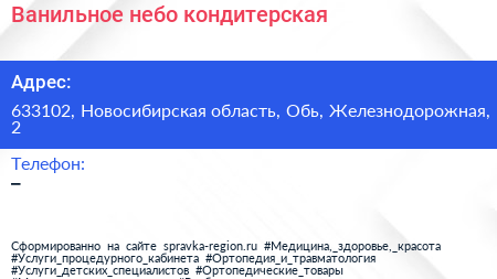 Ванильное небо, кондитерская по адресу 633102, Новосибирская область, Обь, Железнодорожная, 2 в дальнейшем Организация, размещена в следующих категориях: