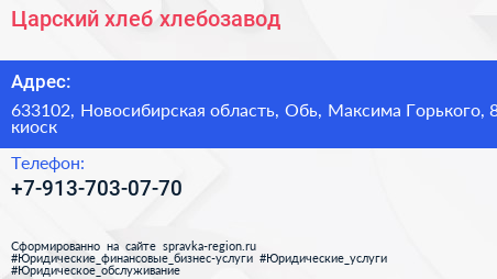 Царский хлеб, хлебозавод по адресу 633102, Новосибирская область, Обь, Максима Горького, 8 киоск в дальнейшем Организация, размещена в следующих категориях: