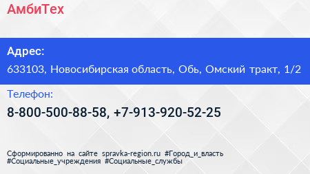 АмбиТех по адресу 633103, Новосибирская область, Обь, Омский тракт, 1/2 в дальнейшем Организация, размещена в следующих категориях: