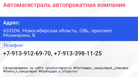 Автомагистраль, автопрокатная компания по адресу 633104, Новосибирская область, Обь, проспект Мозжерина, 8 в дальнейшем Организация, размещена в следующих категориях: