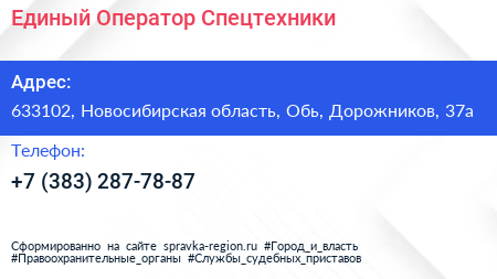 Единый Оператор Спецтехники по адресу 633102, Новосибирская область, Обь, Дорожников, 37а в дальнейшем Организация, размещена в следующих категориях: