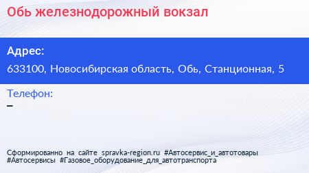 Обь, железнодорожный вокзал по адресу 633100, Новосибирская область, Обь, Станционная, 5 в дальнейшем Организация, размещена в следующих категориях: