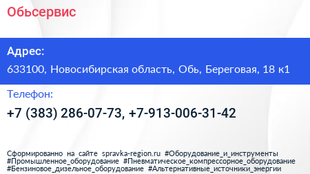 Обьсервис по адресу 633100, Новосибирская область, Обь, Береговая, 18 к1 в дальнейшем Организация, размещена в следующих категориях: