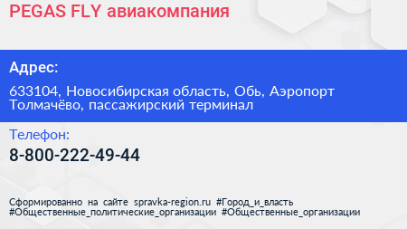 PEGAS FLY, авиакомпания по адресу 633104, Новосибирская область, Обь, Аэропорт Толмачёво, пассажирский терминал в дальнейшем Организация, размещена в следующих категориях: