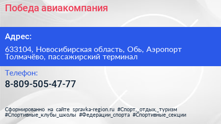 Победа, авиакомпания по адресу 633104, Новосибирская область, Обь, Аэропорт Толмачёво, пассажирский терминал в дальнейшем Организация, размещена в следующих категориях: