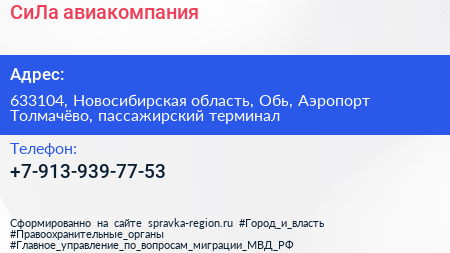 СиЛа, авиакомпания по адресу 633104, Новосибирская область, Обь, Аэропорт Толмачёво, пассажирский терминал в дальнейшем Организация, размещена в следующих категориях: