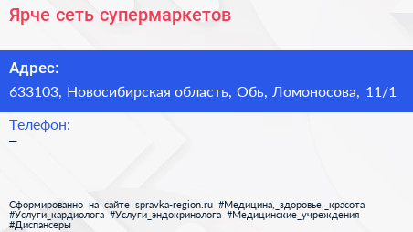 Ярче!, сеть супермаркетов по адресу 633103, Новосибирская область, Обь, Ломоносова, 11/1 в дальнейшем Организация, размещена в следующих категориях: