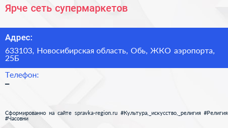Ярче!, сеть супермаркетов по адресу 633103, Новосибирская область, Обь, ЖКО аэропорта, 25Б в дальнейшем Организация, размещена в следующих категориях: