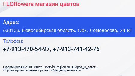 FLOflowers, магазин цветов по адресу 633103, Новосибирская область, Обь, Ломоносова, 24 к1 в дальнейшем Организация, размещена в следующих категориях: