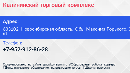 Калининский, торговый комплекс по адресу 633102, Новосибирская область, Обь, Максима Горького, 3 к1 в дальнейшем Организация, размещена в следующих категориях: