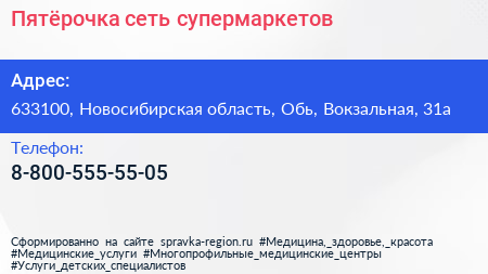 Пятёрочка, сеть супермаркетов по адресу 633100, Новосибирская область, Обь, Вокзальная, 31а в дальнейшем Организация, размещена в следующих категориях: