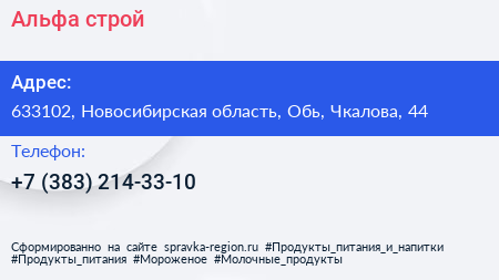 Альфа-строй по адресу 633102, Новосибирская область, Обь, Чкалова, 44 в дальнейшем Организация, размещена в следующих категориях: