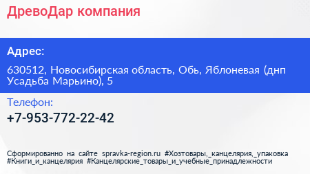 ДревоДар, компания по адресу 630512, Новосибирская область, Обь, Яблоневая (днп Усадьба Марьино), 5 в дальнейшем Организация, размещена в следующих категориях: