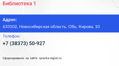 Библиотека №1 по адресу 633102, Новосибирская область, Обь, Кирова, 10 в дальнейшем Организация, размещена в следующих категориях: