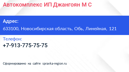 Автокомплекс, ИП Джангоян М.С. по адресу 633100, Новосибирская область, Обь, Линейная, 121 в дальнейшем Организация, размещена в следующих категориях: