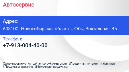 Автосервис по адресу 633100, Новосибирская область, Обь, Вокзальная, 45 в дальнейшем Организация, размещена в следующих категориях: