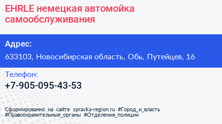 EHRLE, немецкая автомойка самообслуживания по адресу 633103, Новосибирская область, Обь, Путейцев, 16 в дальнейшем Организация, размещена в следующих категориях: