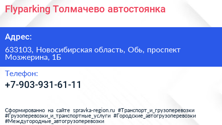 Flyparking-Толмачево, автостоянка по адресу 633103, Новосибирская область, Обь, проспект Мозжерина, 1Б в дальнейшем Организация, размещена в следующих категориях: