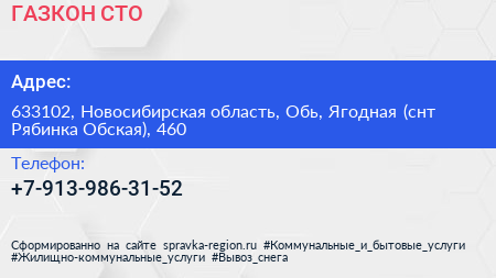 ГАЗКОН, СТО по адресу 633102, Новосибирская область, Обь, Ягодная (снт Рябинка Обская), 460 в дальнейшем Организация, размещена в следующих категориях: